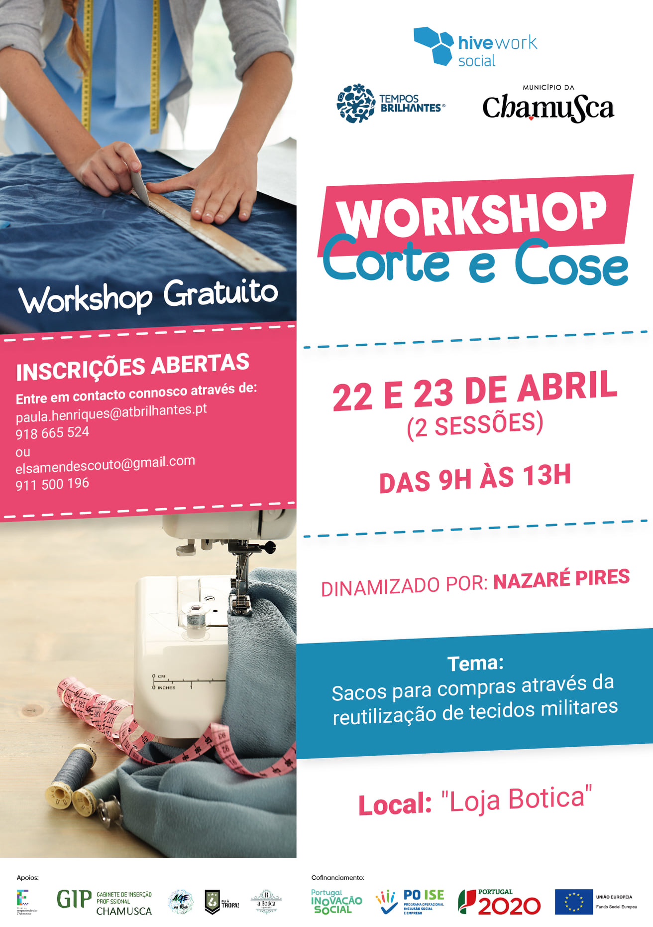 Quando aprendemos e criamos em cooperação tudo faz sentido! Mais do que workshops, serão experiências enriquecedoras onde para além de técnica de costura poderás desenvolver competências como colaboração e criatividade! Inscreve-te já e faz parte daqueles que estão a contribuir para a criação de um ambiente criativo e empreendedor na Chamusca, a Oficina Colaborativa Hivework Social:))